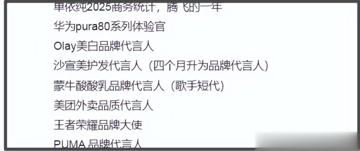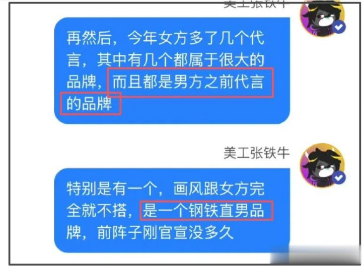 第二点是两人代言有重合,爆料称女方今年多了好几个大品牌代言,其中有几个都是男方代言过的品牌,还强调女方新官宣的一个“钢铁直男”属性的代言,跟她本人完全不搭。
